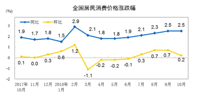 智通財(cái)經(jīng)APP獲悉,11月9日,國家統(tǒng)計(jì)局發(fā)布10月份CPI數(shù)據(jù)和PPI數(shù)據(jù)。2018年10月份,全國居民消費(fèi)價格同比上漲2.5%,預(yù)期2.5%,前值2.5%。其中,城市上漲2.5%,農(nóng)村上漲2.6%;食品價格上漲3.3%,非食品價格上漲2.4%;消費(fèi)品價格上漲2.8%,服務(wù)價格上漲2.1%。1-10月平均,全國居民消費(fèi)價格比去年同期上漲2.1%。