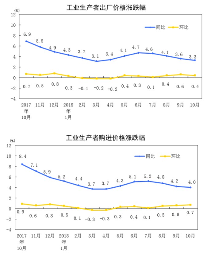 2018年10月份,全國工業(yè)生產(chǎn)者出廠價格同比上漲3.3%,預(yù)期3.3%,前值3.6%。環(huán)比上漲0.4%,前值0.6%。工業(yè)生產(chǎn)者購進(jìn)價格同比上漲4.0%,環(huán)比上漲0.7%。1-10月平均,工業(yè)生產(chǎn)者出廠價格比去年同期上漲3.9%,工業(yè)生產(chǎn)者購進(jìn)價格上漲4.5%。