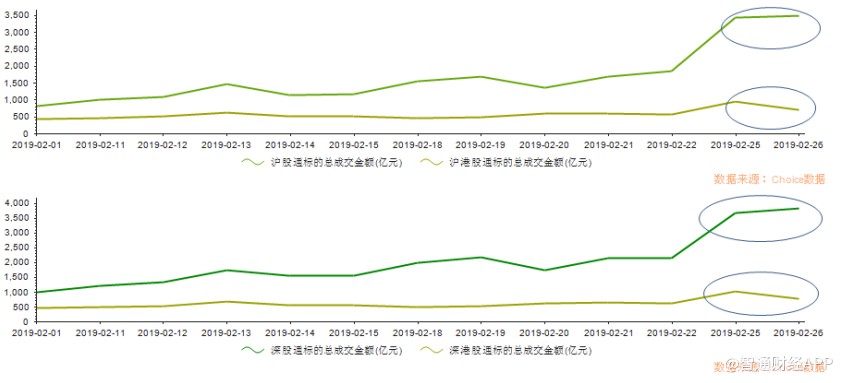 隨著兩地逐漸趨于技術(shù)牛市的形態(tài),2月的滬(深)股通、滬(深)港股通標(biāo)的總成交金額折線一路向上,近兩日驟然上揚(yáng)。