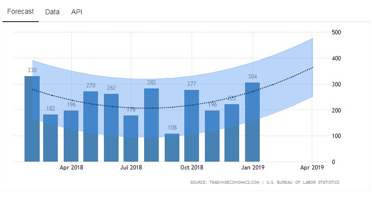 根據(jù)Trading Economics的預(yù)測,2月非農(nóng)數(shù)據(jù)將會延續(xù)1月的勢頭,呈現(xiàn)上行趨勢。