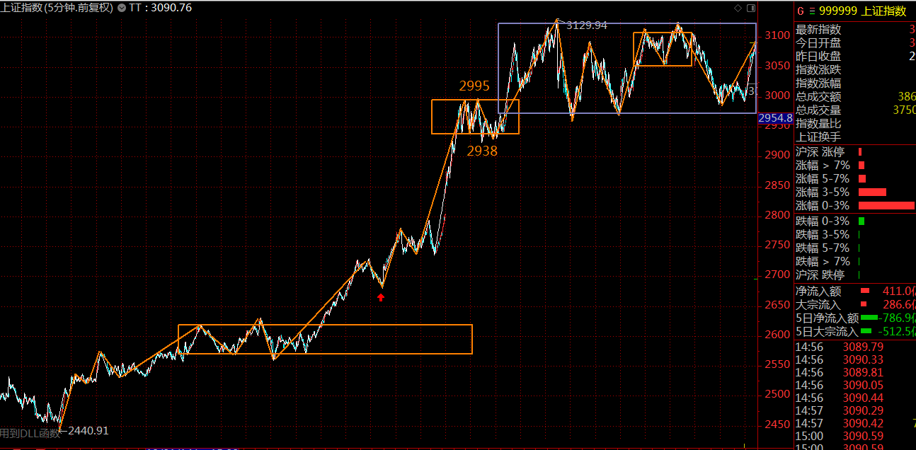上證指數(shù)方面,這個(gè)位置的30分鐘中樞已構(gòu)建完成,調(diào)整隨時(shí)可以結(jié)束,方向選擇待定,關(guān)注30分鐘中樞上軌3125點(diǎn)壓力,30分鐘中樞下軌2968點(diǎn)支撐。就目前的市場情緒來看,傾向于向上突破中樞,構(gòu)建30分鐘的第三類買點(diǎn)(突破中樞上軌后,回調(diào)段不破中樞上軌)。