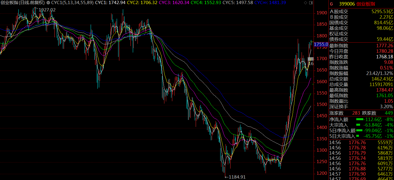 周一市場(chǎng)突破三月份的中樞結(jié)構(gòu),開啟了新一輪的上漲,市場(chǎng)情緒良好,基本維持了日均百股漲停的規(guī)模。至周四,滬指上漲5.04%報(bào)收3246.57點(diǎn),深成指漲5.14%報(bào)收10415.8點(diǎn),創(chuàng)業(yè)板漲4.94%報(bào)收1777.26點(diǎn)。值得留意的是,相較于第一波行情創(chuàng)業(yè)板指數(shù)大幅跑贏上證指數(shù)來說,這一次代表小盤股的創(chuàng)業(yè)板指數(shù)要弱于預(yù)期。