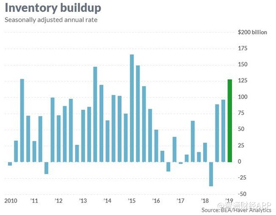 美國官方表示,1季度的增長超出了預(yù)期,部分原因是強(qiáng)勁的庫存增長。根據(jù)政府的數(shù)據(jù),本季度新增商品庫存320億美元,折合年率為1280億美元,推動了GDP增長約70個基點(diǎn)。