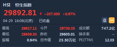 智通財經(jīng)APP獲悉,恒指早盤高開125.84點或0.43%,報29730.85點。截至收盤,恒生指數(shù)漲287.8點或0.97%,報29892.81點,全日成交額達(dá)747.22億。國企指數(shù)漲1.11%,報11638.18點,紅籌指數(shù)漲0.83%,報4620.34點。