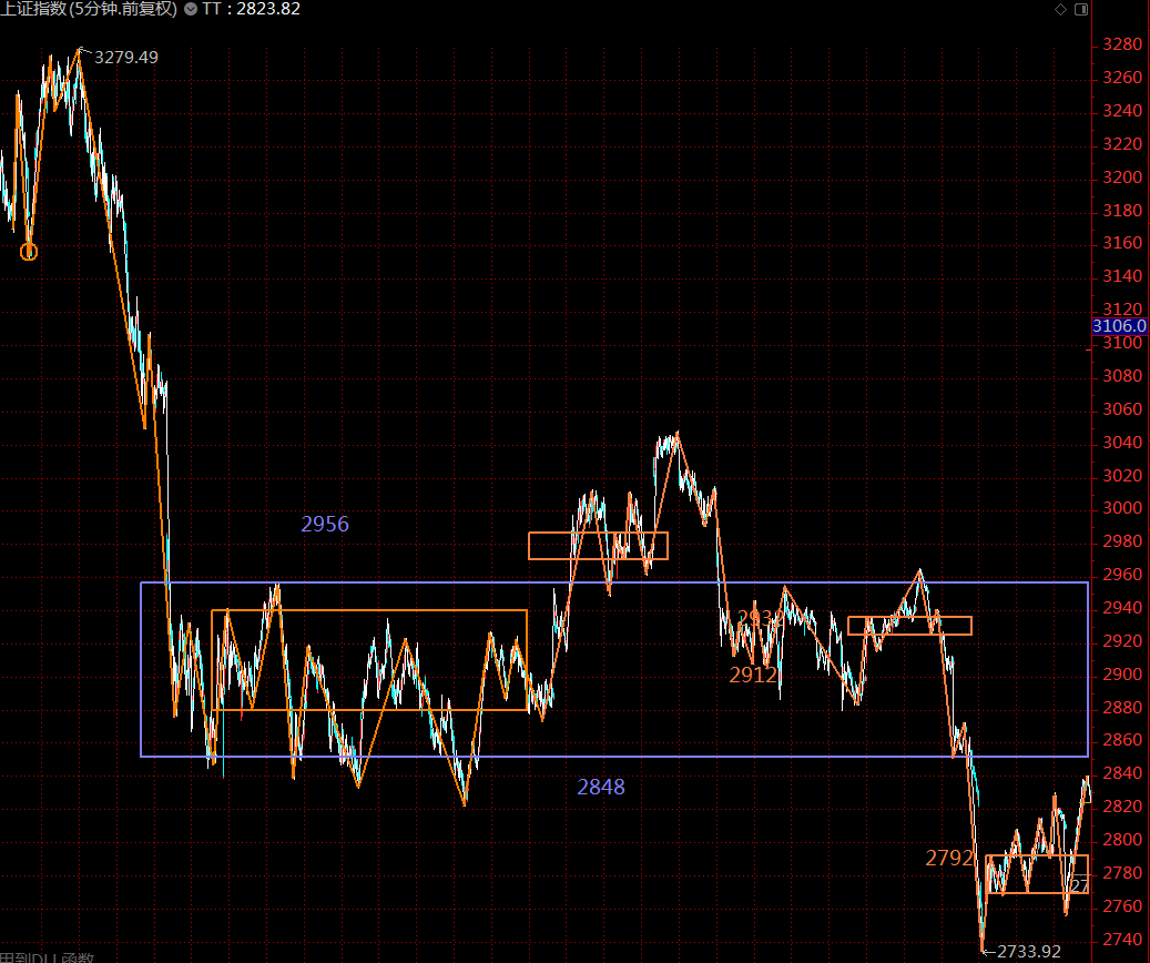 上周市場(chǎng)整體都處在構(gòu)建第三類(lèi)賣(mài)點(diǎn)的階段,周五的高點(diǎn)2840目前初步確認(rèn)為第三類(lèi)賣(mài)點(diǎn)的精確位置,如果就此轉(zhuǎn)下,下一步2792點(diǎn)就顯得尤為重要,如果往下的五分鐘線(xiàn)段未能跌破2792點(diǎn),那這個(gè)位置是一個(gè)合理的建倉(cāng)點(diǎn),等同于針對(duì)下方三十分鐘中樞(九段擴(kuò)張)的第三類(lèi)買(mǎi)點(diǎn)。
