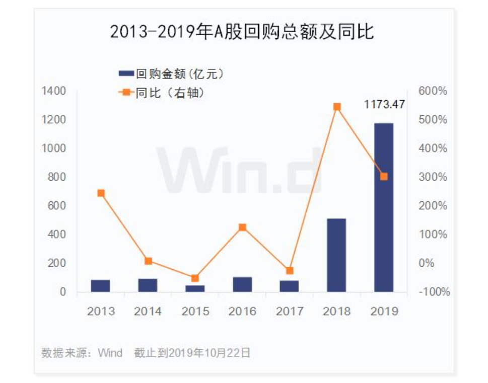 2、A股回購數(shù)量和金額呈爆發(fā)式增長:截止10月22日,2019年兩市已有974家公司實(shí)施了1397筆回購,總回購金額已達(dá)1173.47億元,較去年同期增幅超過3倍。