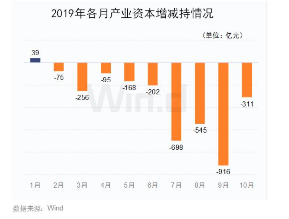 3、產(chǎn)業(yè)資本減持:Wind數(shù)據(jù)統(tǒng)計顯示,截止到10月22日,今年A股產(chǎn)業(yè)資本凈減持3225.62億元,已連續(xù)9個月凈減持。