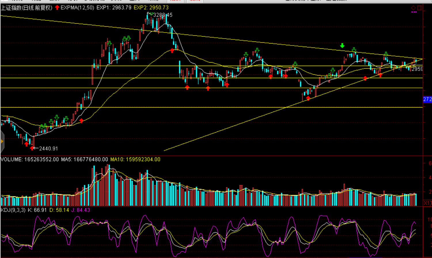 技術面:自9月16日以來滬綜指形成的收斂三角形面臨方向選擇,今日是第34個交易變盤窗口,一旦向上,則形成趨勢性反彈概率較大。