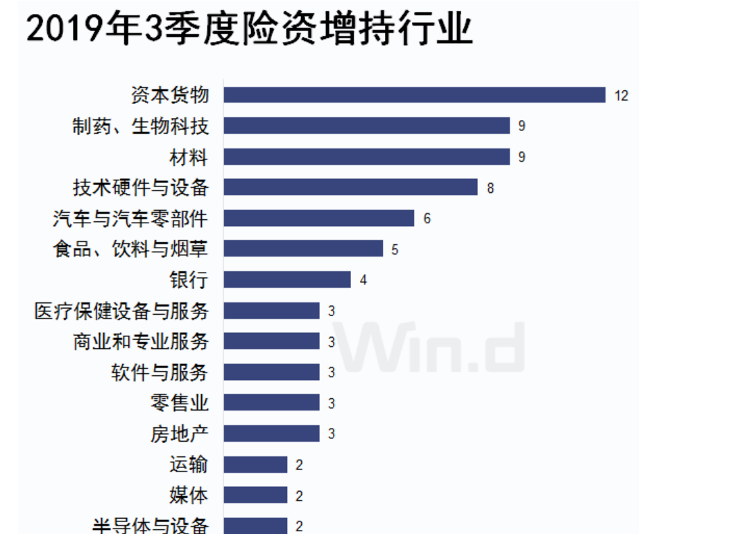 險資財大氣粗,其一舉一動受到資本市場密切關(guān)注:據(jù)Wind數(shù)據(jù)統(tǒng)計,截止2019年3季度末,兩市共有376家上市公司被險資持有,持有股數(shù)約為833.21億股;132只保險產(chǎn)品共持有約12380億元市值A(chǔ)股股票。資本貨物、醫(yī)藥、軟硬件、食品等獲重點增持。