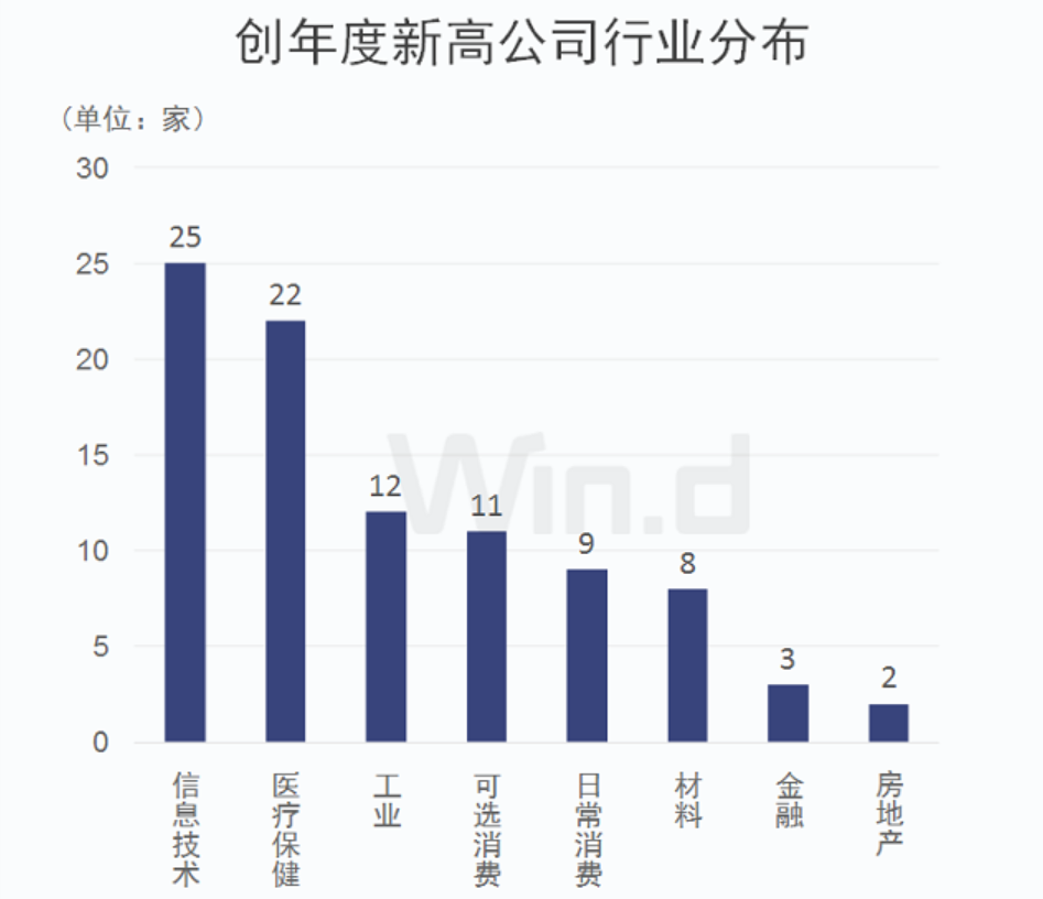 Wind統(tǒng)計顯示,有92家公司近3日最高股價創(chuàng)今年以來新高。從相關公司行業(yè)分布來看,信息技術類最多,有25家;醫(yī)療保健行業(yè)緊隨其后,有22家,工業(yè)、可選消費均有超過10家公司。可見,科技和生物醫(yī)藥類公司成為牛股聚集地。