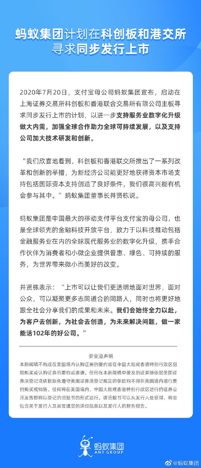 7月20日下午,支付寶母公司螞蟻集團在官方微博宣布,該集團計劃在科創(chuàng)板和港交所尋求同步發(fā)行上市。