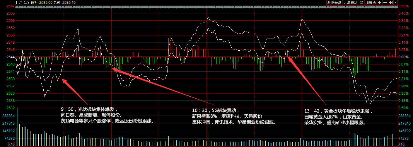 兩市今日幾近平開,早盤三大指數(shù)下探后集體回升翻紅,光伏、5G概念領(lǐng)漲市場。午后兩市沖高回落,黃金、抖音等概念有所表現(xiàn)但券商板塊跳水拖累指數(shù)回落翻綠,市場賺錢效應(yīng)較弱。