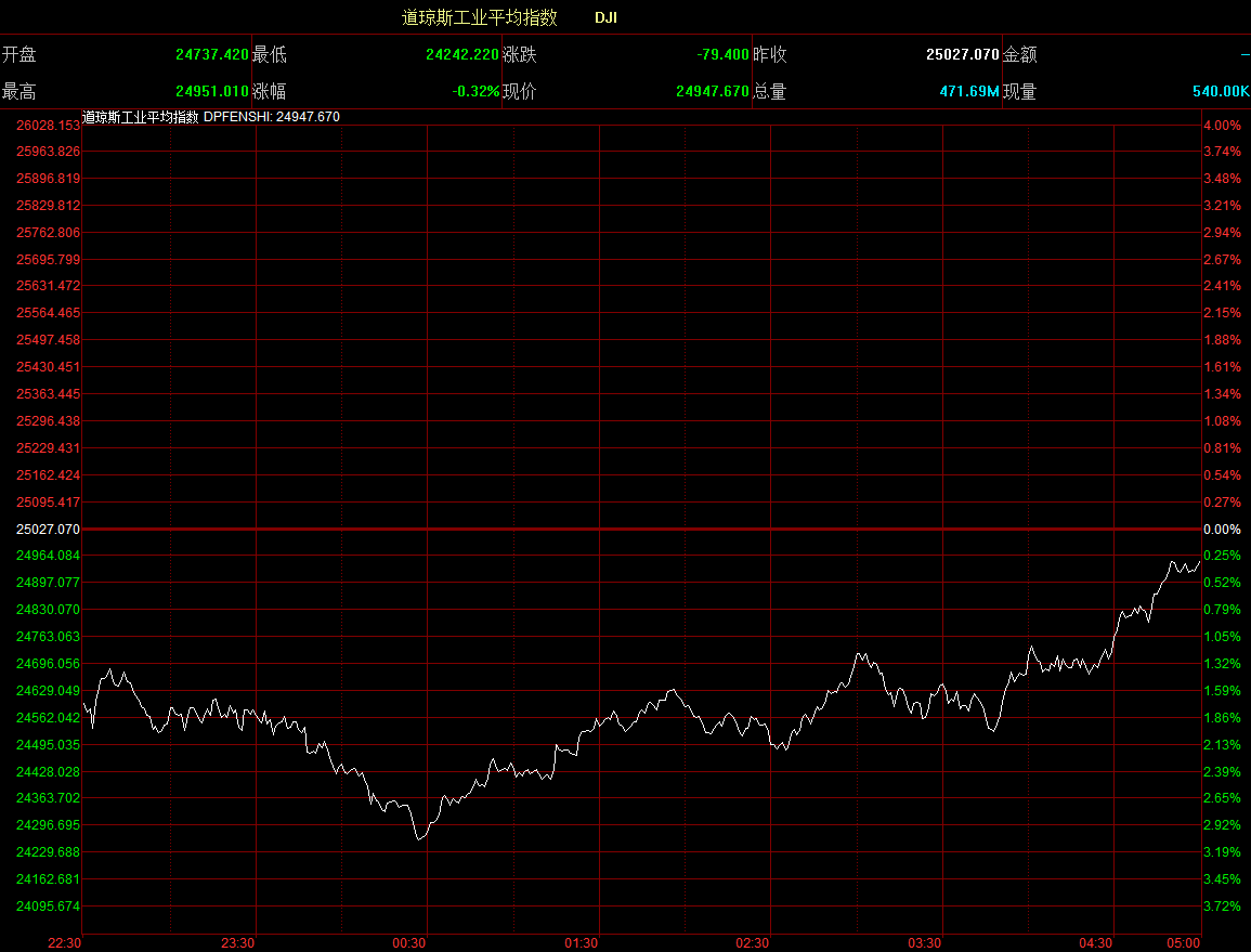 美國股市收復早段跌勢,三大指數(shù)收市窄幅上落。道指低開289點后愈跌愈急,至中段最多跌784點,其后跌勢大幅回順,全日收報24947點,跌79點。
