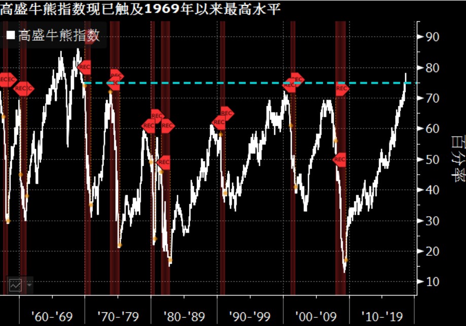 高盛一個(gè)旨在“合理預(yù)警未來熊市風(fēng)險(xiǎn)”的指標(biāo)現(xiàn)已升至將近50年來的最高水平。基于股市估值、經(jīng)濟(jì)增長動能、失業(yè)率、通貨膨脹、收益率曲線等數(shù)據(jù)指標(biāo)的高盛牛熊指數(shù)目前觸及的水平為1969年來所不曾見。