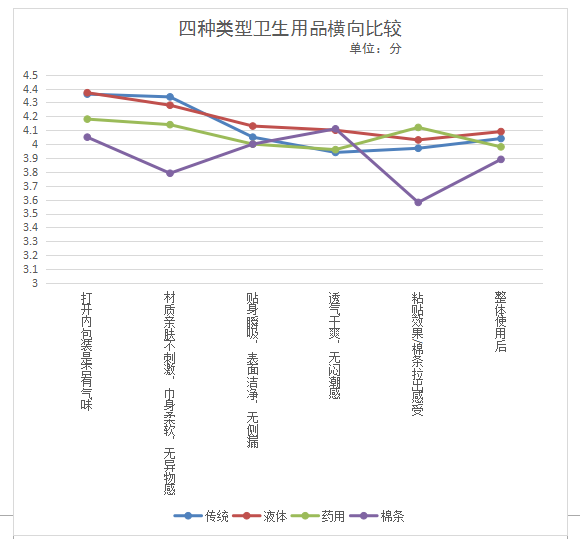 本次衛(wèi)生巾比較試驗共招募150名目前沒有從事有關衛(wèi)生巾行業(yè)的年齡介于16-45歲之間的消費者分別對傳統(tǒng)型衛(wèi)生巾、新型衛(wèi)生巾(液體材料衛(wèi)生巾)、衛(wèi)生棉條、功能性(藥用)衛(wèi)生巾四種類型商品進行體驗。要求體驗消費者對所使用的衛(wèi)生用品進行1-5分的評價(1分最低,5分最高),主要體驗內(nèi)容及感受如下: