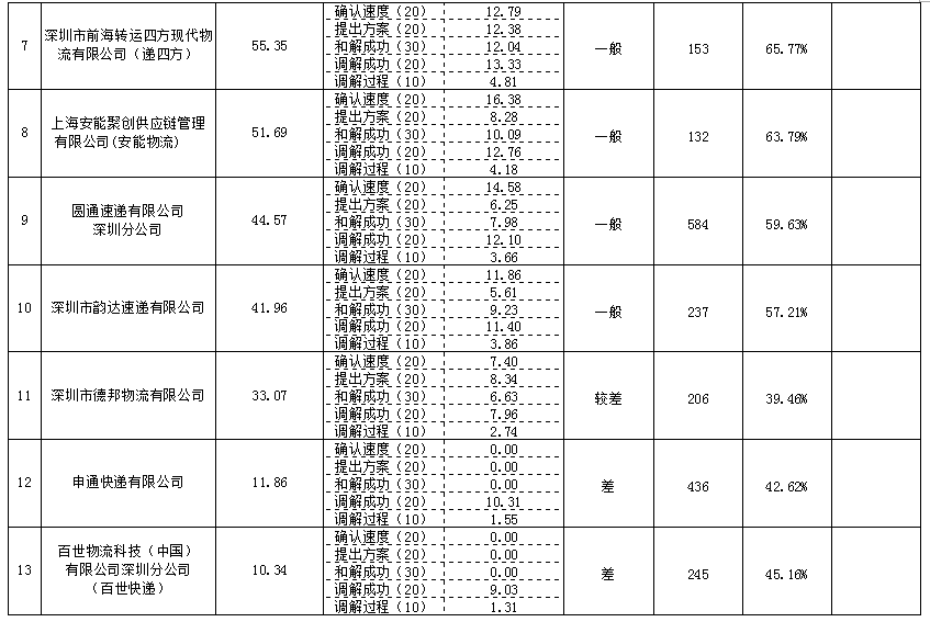據(jù)市消委會(huì)數(shù)據(jù)顯示,深圳市快遞物流行業(yè)消費(fèi)維權(quán)信用指數(shù)排名前三的企業(yè)分別是:中國郵政速遞物流股份有限公司深圳分公司,消費(fèi)維權(quán)信用指數(shù)89.17,信用等級優(yōu)秀;深圳海帶寶網(wǎng)絡(luò)科技有限公司,消費(fèi)維權(quán)信用指數(shù)80.10,信用等級優(yōu)秀;順豐速運(yùn)有限公司,消費(fèi)維權(quán)信用指數(shù)72.55,信用等級良好。本次排名靠后的企業(yè)是:深圳市德邦物流有限公司,消費(fèi)維權(quán)信用指數(shù)33.07,信用等級較差;申通快遞有限公司,消費(fèi)維權(quán)信用指數(shù)11.86,信用等級差;百世物流科技(中國)有限公司深圳分公司,消費(fèi)維權(quán)信用指數(shù)10.34,信用等級差,排名最后。