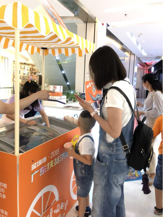 6月23日,“甜蜜初夏 慈善一直在”深圳10大地標冰激凌義賣活動在在福田星河COCO Park啟動?,F(xiàn)場,很多逛商場的市民掃碼購買冰淇淋,為扶貧濟困活動捐款。特別讓志愿者感觸的是,不少家長帶著小朋友路過,看到是給貧困人們貢獻愛心,紛紛參與進來要買冰激凌。