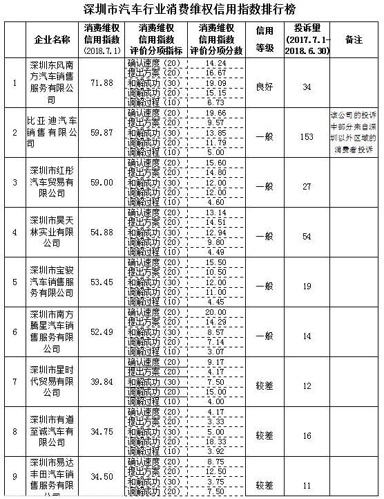一、深圳市汽車行業(yè)消費維權(quán)信用指數(shù)排行榜