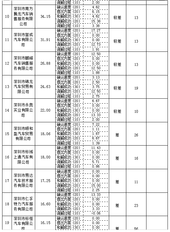 在細(xì)分指標(biāo)方面,深圳市標(biāo)域汽車有限公司、深圳標(biāo)特汽車(集團(tuán))有限公司和深圳市宏創(chuàng)陸風(fēng)汽車銷售有限公司等27家企業(yè)處理投訴不及時,未積極與消費者先行和解,導(dǎo)致其企業(yè)“確認(rèn)速度”、“提出方案”和“和解成功”三項分項指標(biāo)的分?jǐn)?shù)皆為0,嚴(yán)重影響了企業(yè)的消費維權(quán)信用指數(shù)和信用等級。深圳市仁孚特力汽車服務(wù)有限公司、深圳市安進(jìn)汽車貿(mào)易有限公司和深圳市大興寶譽汽車銷售服務(wù)有限公司在由消委會工作人員評分的“調(diào)解過程”分項指標(biāo)分?jǐn)?shù)為負(fù)分,3家企業(yè)存在不配合調(diào)解甚至拒絕調(diào)解的情況,解決消費糾紛的誠意度較差;另外,深圳市宏創(chuàng)陸風(fēng)汽車銷售有限公司的消費維權(quán)信用指數(shù)為0,誠意度和滿意度為0,10宗消費投訴皆未處理成功,排名最后。