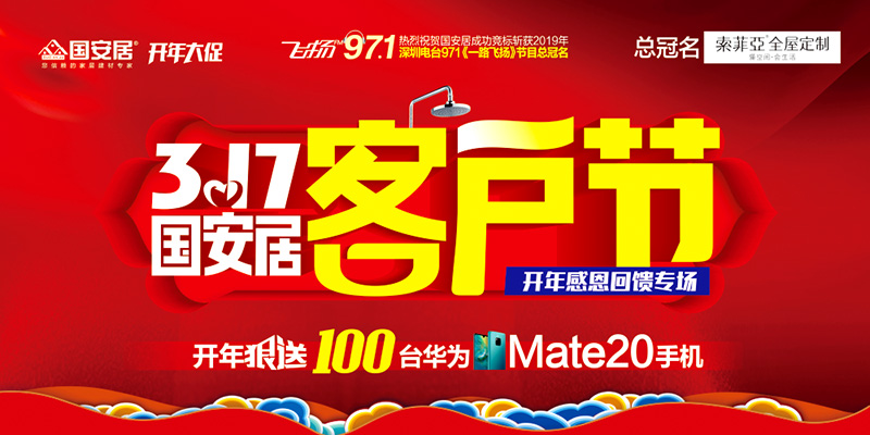 國(guó)安居一直心懷感恩,感謝十多年來(lái)累計(jì)30萬(wàn)老客戶的信賴與支持,此次活動(dòng)不僅是為了品牌優(yōu)惠,更多的是給老客戶送去關(guān)懷和福利。國(guó)安居特聯(lián)合深圳電臺(tái)971王牌節(jié)目一路飛揚(yáng)鼎力巨獻(xiàn),聯(lián)手旗下百位工廠總裁打造開(kāi)年大促,推出多重優(yōu)惠:1、開(kāi)年狠送100臺(tái)華為mate20手機(jī);2、聯(lián)購(gòu)滿額返100萬(wàn)現(xiàn)金,上不封頂?shù)瘸祷仞伝顒?dòng),以3.15為契機(jī)來(lái)回饋多年來(lái)關(guān)注國(guó)安居、支持國(guó)安居的廣大消費(fèi)者,以最大限度的優(yōu)惠、最為超值的實(shí)惠、最為驚喜的鉅惠獻(xiàn)禮3.17大促!