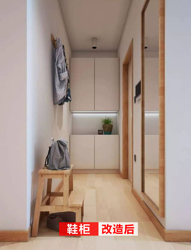 改造后的簡(jiǎn)潔清爽,和原來(lái)根本就是天差地別,干凈的白色到頂柜子,可以收納很多鞋子及其他物品,連換鞋凳和出門(mén)鏡都一一具備。