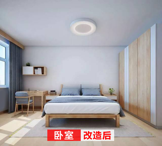 改造后的臥室開(kāi)闊簡(jiǎn)潔,藍(lán)灰色床品與窗簾,色調(diào)一致,一整排的衣柜完全可以滿(mǎn)足生活需求。