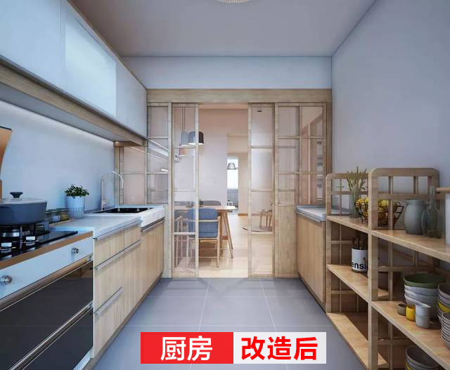改造后的廚房干凈利索,各個(gè)功能區(qū)分明顯,木質(zhì)的隔板、柜子實(shí)用美觀,還利用玻璃移門(mén)分隔了廚房與外部。