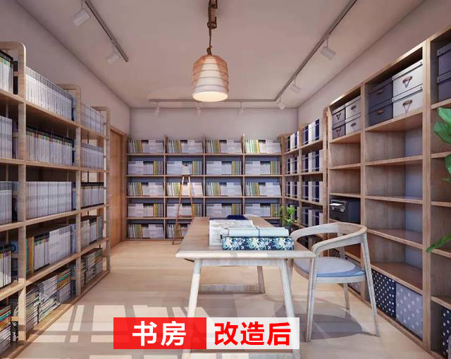 改造后的書(shū)房,三面書(shū)柜,足夠解決儲(chǔ)存空間不足的問(wèn)題;有一塊專(zhuān)門(mén)用于辦公的區(qū)域,閑時(shí)可以坐在懶人椅上看看書(shū),這也是非常寫(xiě)意的生活。
