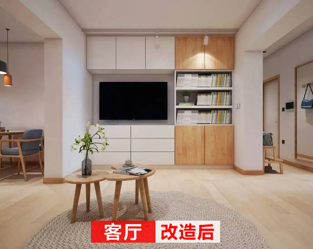 改造后的客廳同樣干凈簡(jiǎn)潔,打造一面電視柜做儲(chǔ)物,抽屜+儲(chǔ)物柜+書(shū)柜的設(shè)計(jì),能夠滿(mǎn)足客廳的收納需求。