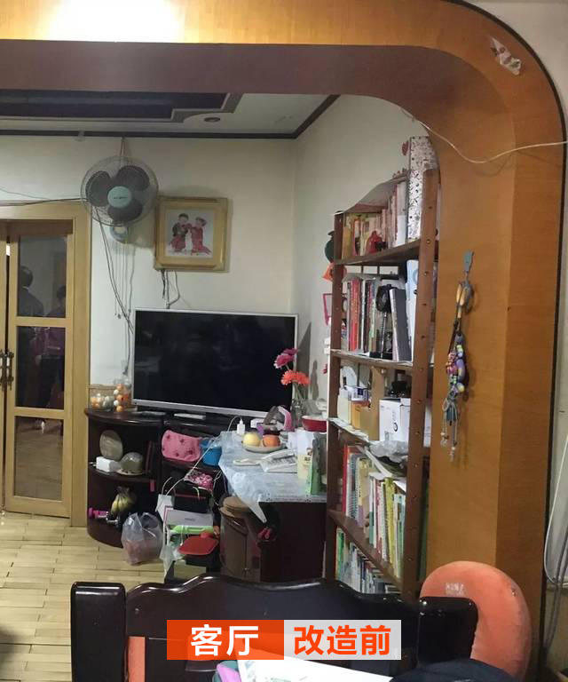 改造前客廳包了一個(gè)大門(mén)套,看起來(lái)不美觀,而且很笨重;客廳也放了一部分書(shū),七七八八的東西塞在電視柜下,顯得客廳也是雜亂無(wú)章。