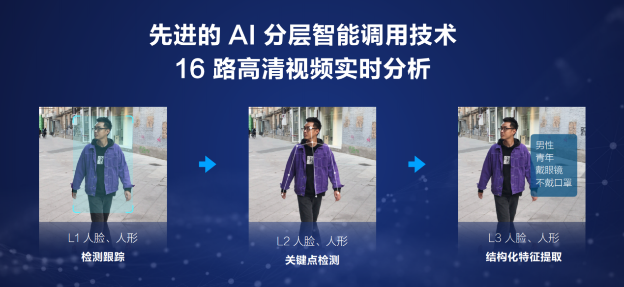 針對邊緣計算的硬件架構(gòu)特點,360家庭安全大腦·旗艦版設(shè)計了邊緣側(cè)AI調(diào)度引擎,分層智能調(diào)用,從人臉人形的基礎(chǔ)檢測跟蹤到關(guān)鍵點提取和圖像優(yōu)選再到結(jié)構(gòu)化特征提取比對,層層遞進(jìn),最終實現(xiàn)了邊緣側(cè)單機(jī)16路1080P高清視頻實時解碼分析處理。