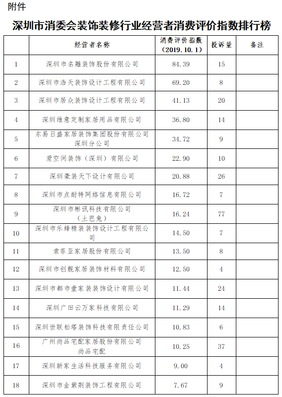 11月20日,深圳市消費(fèi)者委員會(以下簡稱“深圳市消委會”)首次發(fā)布深圳市消委會裝飾裝修行業(yè)消費(fèi)評價指數(shù)排行榜。榜單旨在敦促裝飾裝修行業(yè)經(jīng)營者提升商品和服務(wù)質(zhì)量,為消費(fèi)者提供裝飾裝修消費(fèi)指引,營造安全放心的消費(fèi)環(huán)境。