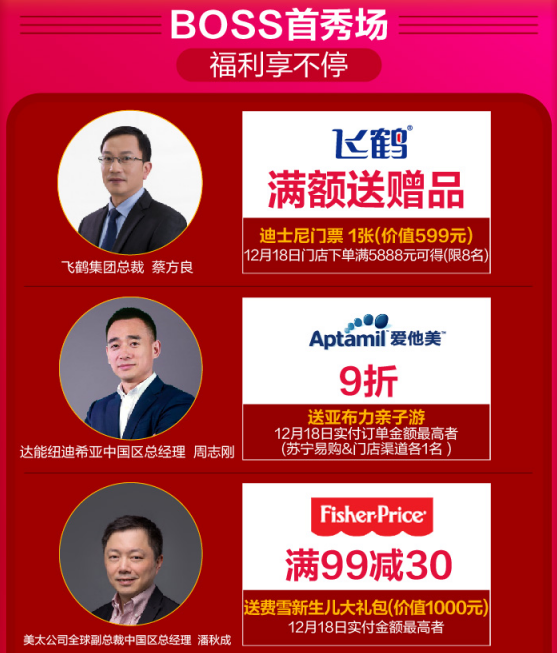 12月18日,蘇寧紅孩子打造了線上線下雙線齊發(fā)的“年終狂歡搶購(gòu)盛典”。母嬰品牌大佬帶頭發(fā)福利,飛鶴集團(tuán)總裁蔡方良、達(dá)能紐迪希亞中國(guó)區(qū)總經(jīng)理周志剛、美太公司全球副總裁中國(guó)區(qū)總經(jīng)理潘秋成、寶潔大中華區(qū)幫寶適副總裁任遠(yuǎn),金佰利大中華區(qū)董事總經(jīng)理Mike等豪送價(jià)值十萬(wàn)大禮。活動(dòng)當(dāng)天,購(gòu)相應(yīng)品牌產(chǎn)品且實(shí)付金額最高者就能將戴森吹風(fēng)機(jī)、老鳳祥黃金、迪士尼門票等大禮免費(fèi)帶回家。
