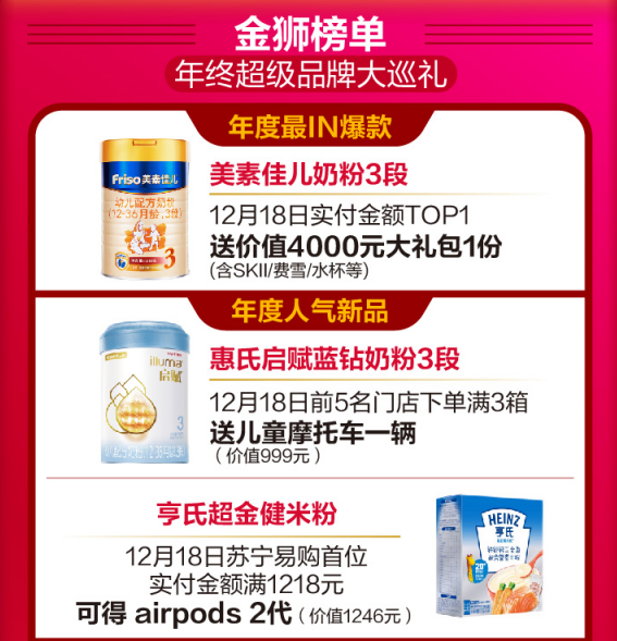 蘇寧紅孩子金獅榜單上,年度最I(lǐng)N爆款、人氣新品、超級(jí)品牌大巡禮,全是親子家庭想要的。寶媽寶爸購(gòu)美素佳兒奶粉3段且實(shí)付金額TOP1的用戶將免費(fèi)獲得價(jià)值4000元大禮包一份;單會(huì)員ID購(gòu)買惠氏藍(lán)鉆系列奶粉實(shí)付金額最高且滿3999元,就送祖馬瓏圣誕限量香氛禮盒一套;購(gòu)買飛鶴奶粉首位且實(shí)付金額滿8888元的消費(fèi)者將獲得華為NOVA5G一個(gè)。此外,亨氏、樂(lè)可愛(ài)、費(fèi)雪、小豬班納、好奇等母嬰品牌都有超值驚喜和好禮相送。