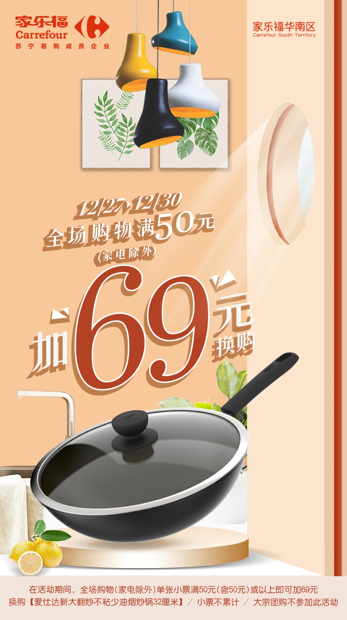 最后播報一則“筍盤”信息。12月27日至30日,顧客在家樂福華南區(qū)門店全場購物滿50元,還可加69元換購愛仕達新大翻炒不粘少油煙炒鍋32厘米(家電、大宗團購除外,小票不累計)。