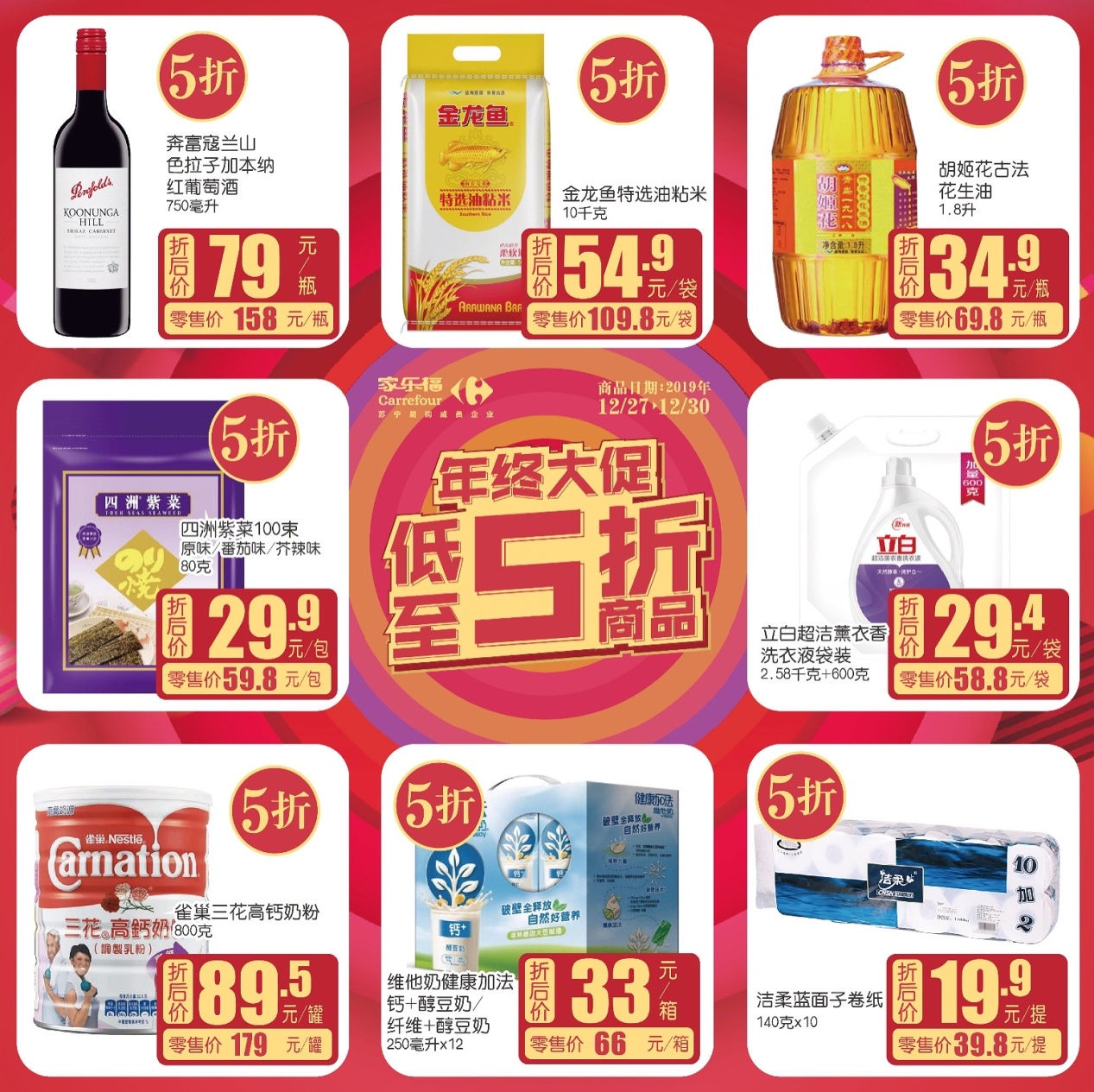 5折雜貨篇:爆款奔富寇蘭山色拉子加本納紅葡萄酒、金龍魚特選油粘米、胡姬花古法花生油、四洲紫菜、雀巢三花高鈣奶粉、立白超潔薰衣香洗衣液、潔柔藍面子卷紙……民生致愛家樂福全知道,滿足您方方面面的需求!
