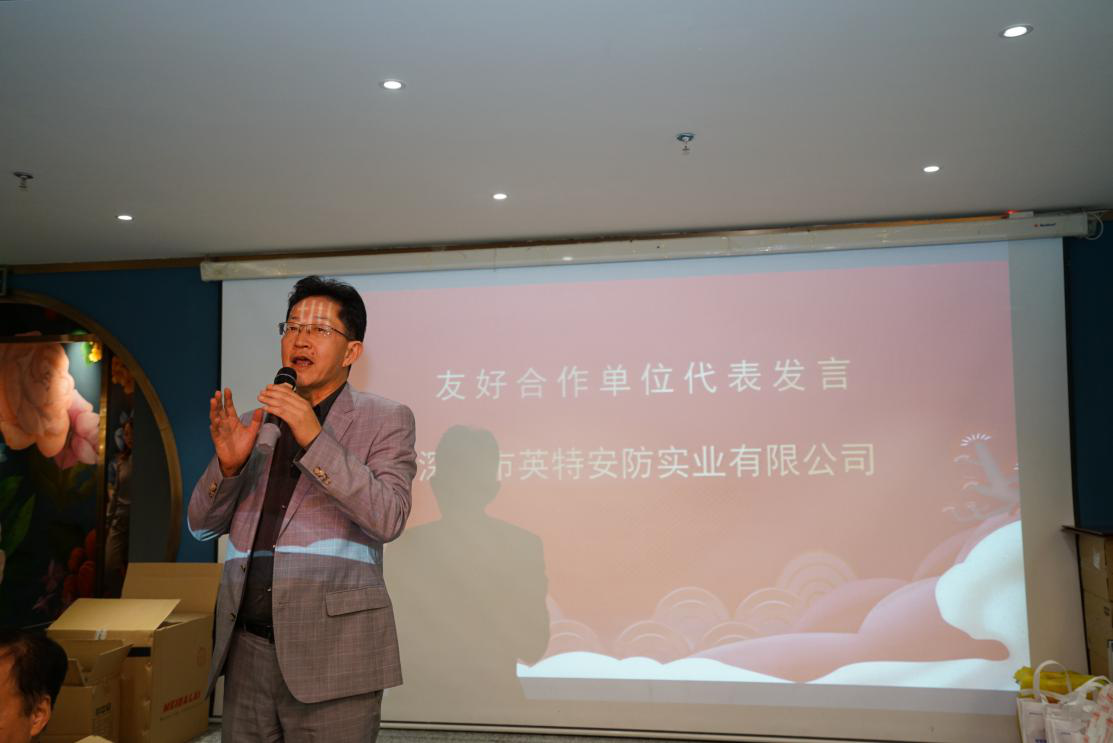 晚宴上,學(xué)會表彰了6家友好合作單位以資感謝支持,并邀請了其中的來自深圳市英特安防實業(yè)有限公司閆建國總經(jīng)理代表發(fā)言。