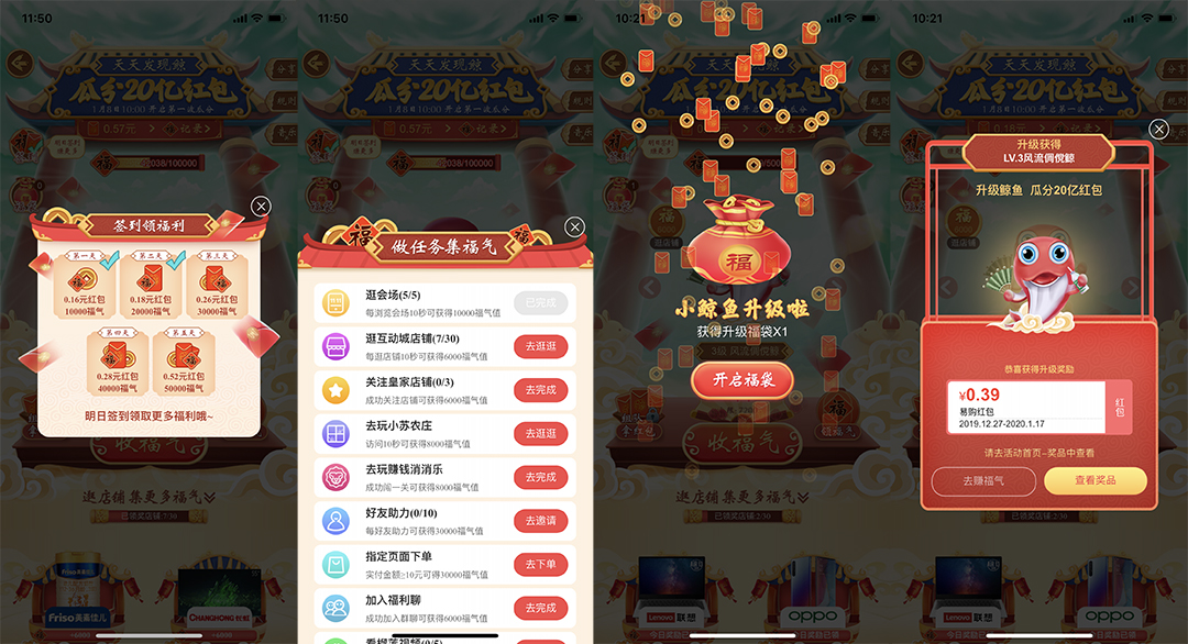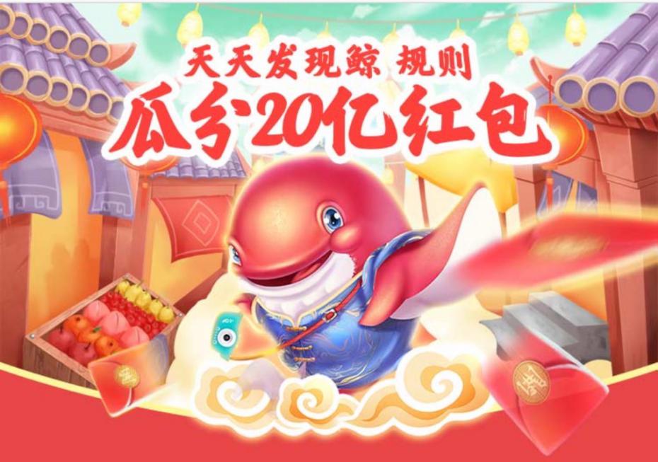用戶通過做任務(wù)、每日簽到、逛品牌店鋪,或者訪問小蘇的農(nóng)莊、玩賺錢消消樂福利游戲均可獲得福氣值以喂養(yǎng)鯨魚,收集到的福氣值越多,福袋將變得越大,鯨魚升級(jí)也越快,可領(lǐng)取的紅包金額也越大。