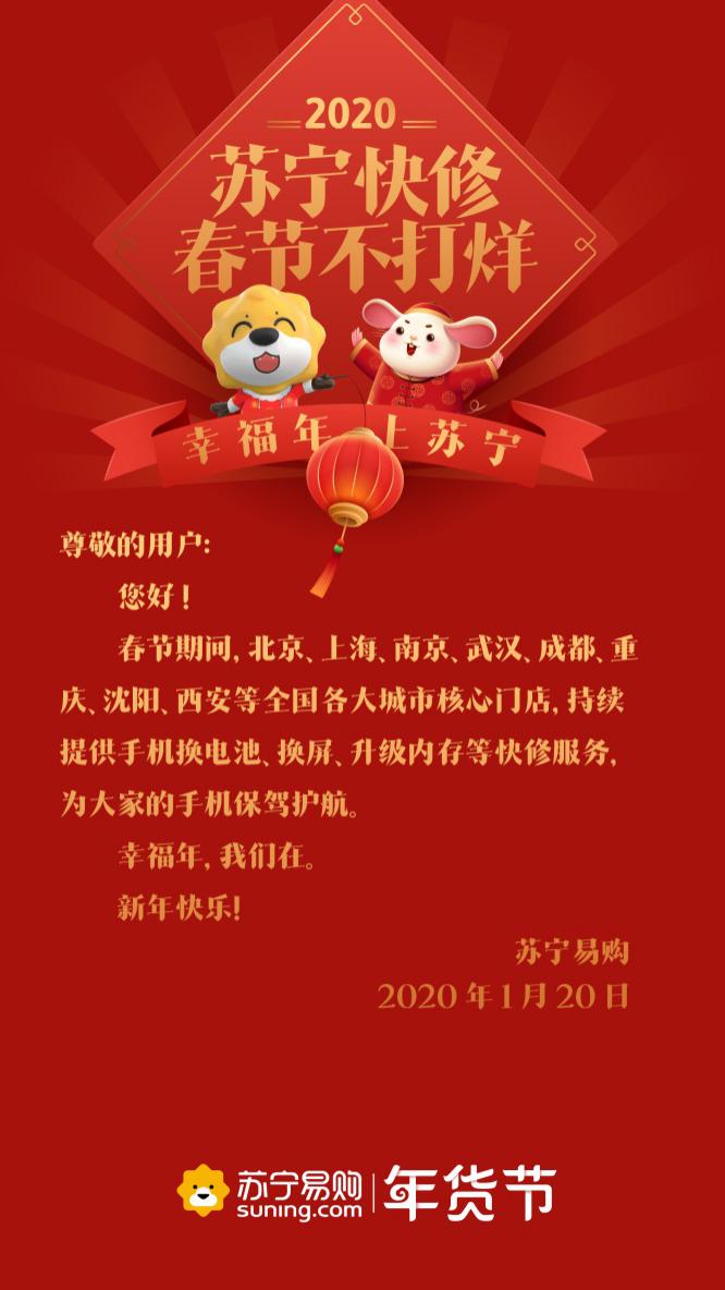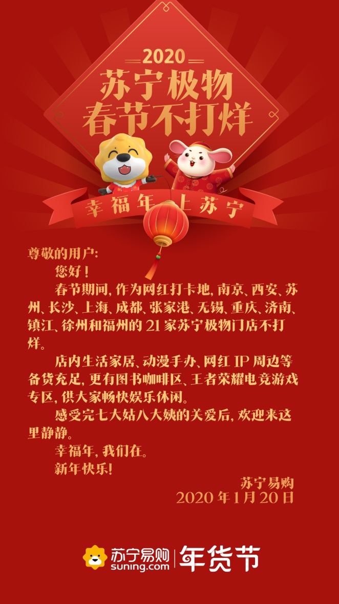 深圳新聞網(wǎng)2020年1月21日訊 春節(jié)臨近,忙著打烊成為了商家常態(tài)。有意思的是,1月20日,蘇寧連發(fā)9條通知,廣而告之“不打烊”。通知顯示,物流、蘇寧幫客、蘇寧快修、以舊換新等服務(wù)內(nèi)容,電器店、家樂(lè)福、零售云、紅孩子門店、極物等線下業(yè)態(tài)都確保不打烊、不漲價(jià)。