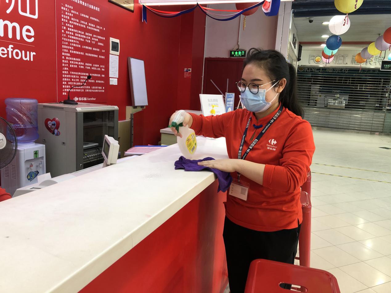 陳翠姣這次被分配到了超市收銀部門,由于是標(biāo)準(zhǔn)化操作,加上使用移動支付的顧客較多,技術(shù)難度不大,在資深員工的耐心指導(dǎo)下,她上手很快。陳翠姣表示對新崗位很滿意,她說,賦閑在家太久了,這次能換崗上任,很開心,“尤其是能夠加入到保障城市民生供應(yīng)的大型商超,非常有意義?!毕挛?點(diǎn),陳翠姣為服務(wù)中心柜臺做第三次消毒清潔后,便可以結(jié)束今日的早班工作,打卡下班了。