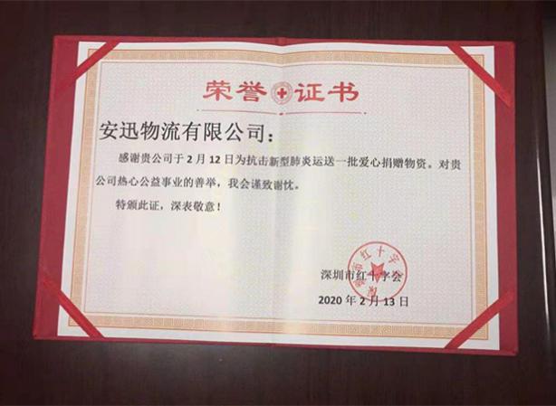 當(dāng)?shù)絻商幘柚攸c(diǎn)收集好物資后,國美物流車輛到達(dá)深圳市疾控中心已是下午兩點(diǎn)多,一路上兩人水米未進(jìn),盡力保證捐贈物資的及時(shí)到位。深圳市紅十字會為國美安迅物流發(fā)來了榮譽(yù)證書,對他們及時(shí)運(yùn)送愛心捐贈物資的善舉表示感謝。