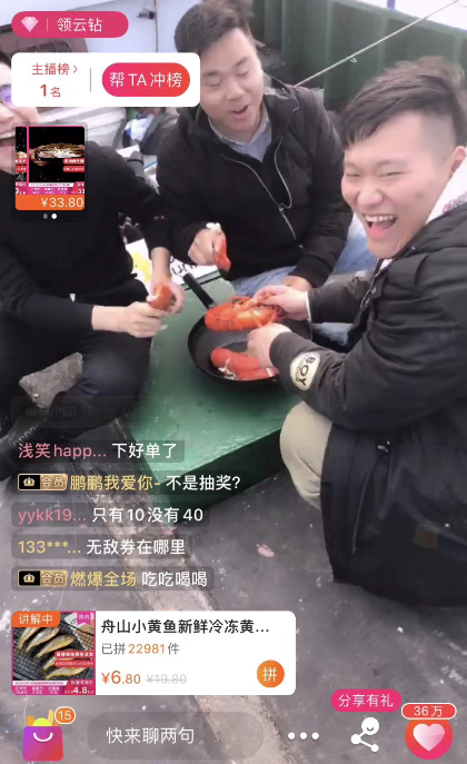 一旁直播的尹鴻狀態(tài)正好,從剛開播到現(xiàn)在,直播間的人數(shù)嗖嗖往上竄,不一會便聚集了十幾萬圍觀群眾。搖晃的直播鏡頭,更具真實感,似乎把觀眾帶到了船上一般。尹鴻馬不停蹄在船上踱步,給觀眾介紹各種海鮮小知識,并大力吆喝起這次直播主打的兩款產(chǎn)品:深海小黃魚和舟山帶魚。“我們蘇寧拼購的海產(chǎn)品都是從張老大這樣漁民手中收來的,下單直發(fā),眼見為實。”