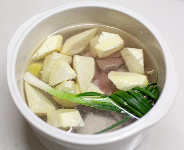 2.把排骨、火腿、干貝、春筍、姜、蔥放入鍋中,加入小鮮侶,加入涼水,放入隔水燉鍋中,燉2.4小時(shí),即可出鍋。