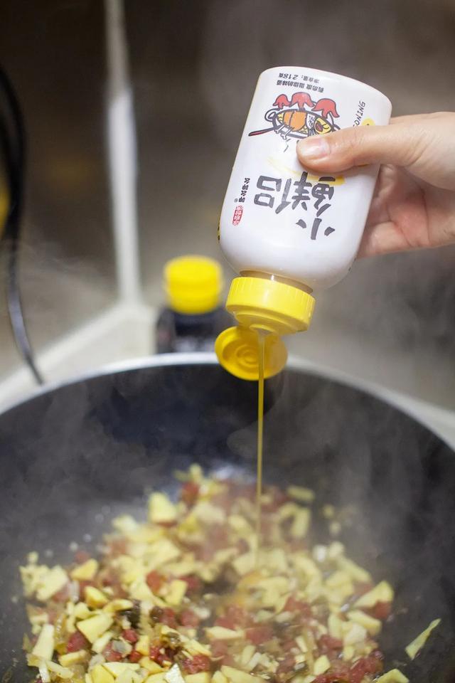 4.加入適量小鮮侶、醬油心生調(diào)味。臘腸、雪菜本身就會(huì)咸,不用再加鹽,食材炒熟即可出鍋。