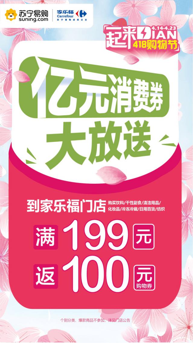 4月9日,家樂福宣布面向全國消費者發(fā)放總額過億的家樂福消費券,旨在提振市民消費信心,促進消費回暖。“418一起來Dian”購物節(jié)期間,凡在家樂福全國209家線下門店購物滿199元,即可獲贈總值100元的消費券(5張20元消費券),覆蓋眾多暢銷品類以及剛需民生商品(消費券可在指定期間使用)。