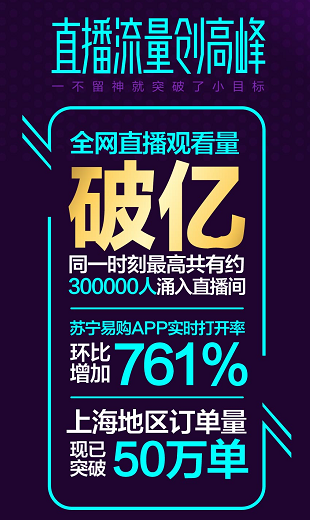 22點30分,直播正式進(jìn)入蘇寧時間。江疏影化身蘇寧“福利官”與主持人周瑾在線安利蘇寧好物,直播吸引在線觀眾上億人次圍觀“剁手”,同一時刻最高峰30萬人涌入直播間。