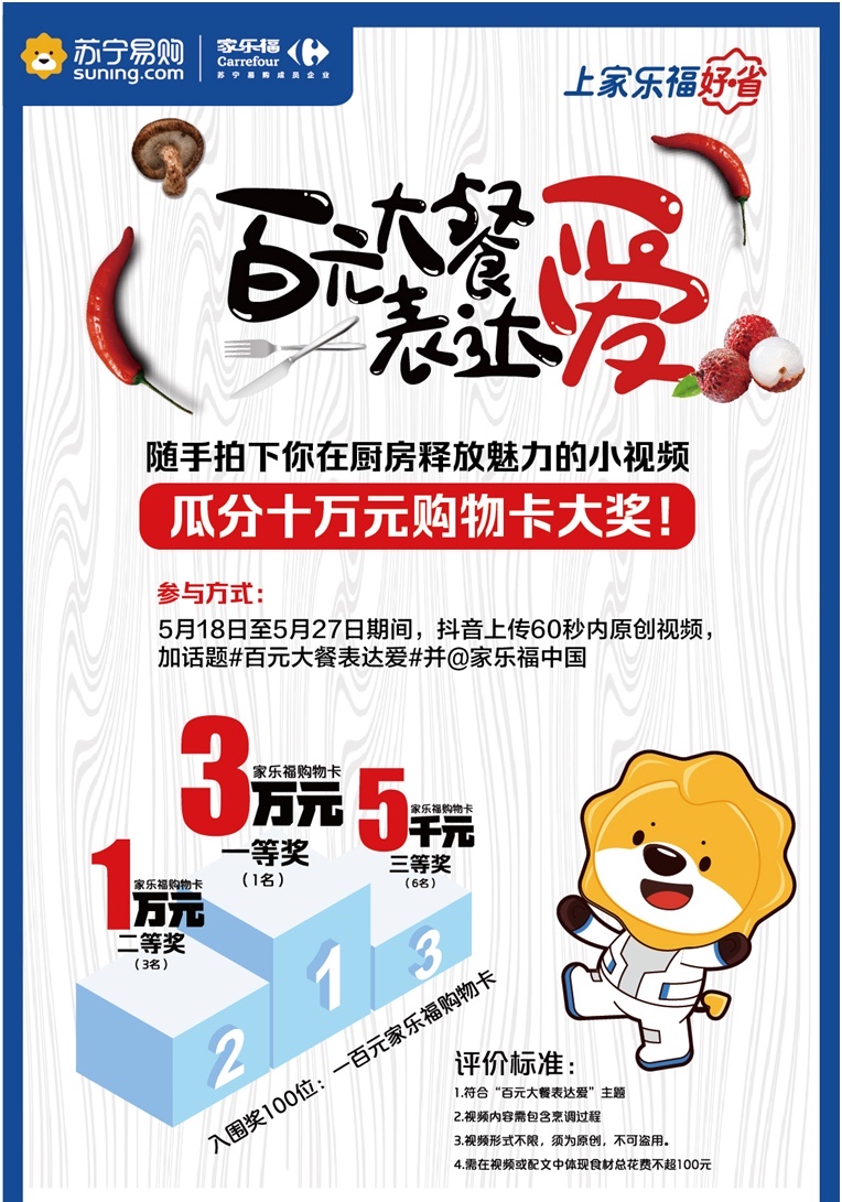 近期陳老伯和女兒聊的最多的除了做菜,還有父女倆都很期待的一場(chǎng)比賽。據(jù)悉,5月18日至6月18日,家樂(lè)福將舉辦一場(chǎng)主題為“百元大餐表達(dá)愛(ài)”的鄰家大廚視頻PK賽,鼓勵(lì)參賽者做道有故事的菜,向摯愛(ài)的人表達(dá)濃濃的情意。你負(fù)責(zé)做菜,家樂(lè)福負(fù)責(zé)買(mǎi)單。你無(wú)需具備可媲美專業(yè)廚師的高超技藝,僅需擁有一顆熱愛(ài)美食的心和一雙巧手,無(wú)論是國(guó)人經(jīng)典標(biāo)配的“四菜一湯”,抑或是最適合情侶的西式浪漫—牛扒配紅酒,隨你發(fā)揮。以百元預(yù)算準(zhǔn)備食材,將烹調(diào)過(guò)程上傳抖音。屆時(shí),突圍選手將有機(jī)會(huì)瓜分價(jià)值十萬(wàn)元的購(gòu)物卡大獎(jiǎng)。