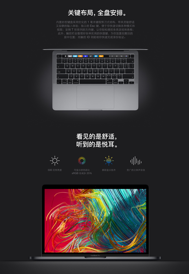從細(xì)節(jié)來看,新款13英寸MacBook Pro輕盈纖薄,僅重1.4千克,厚度15.6毫米。還是"隨身的實(shí)力派",圖片處理速度最高可提升80%多,最高可選配32GB3733MHz內(nèi)存,最高可選配4TB固態(tài)硬盤。讓人心動(dòng)的是可實(shí)現(xiàn)"關(guān)鍵布局,全盤安排":內(nèi)置妙控鍵盤采用優(yōu)化的1毫米鍵程剪刀式結(jié)構(gòu),帶來靈敏舒適又安靜的輸入體驗(yàn);獨(dú)立的Esc鍵,便于你快速切換各種模式和視圖;呈倒T形排列的方向鍵,讓你輕松操縱各類游戲和表格;此外,觸控欄會(huì)整理好各種使用的快捷鍵,為你放置在醒目的居中位置;而觸控ID則能助你快速實(shí)現(xiàn)身份驗(yàn)證。