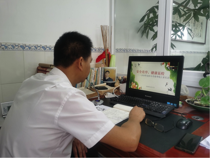 赤沙小學校長李錦賢通過企業(yè)微信召開復學前的線上家長會。