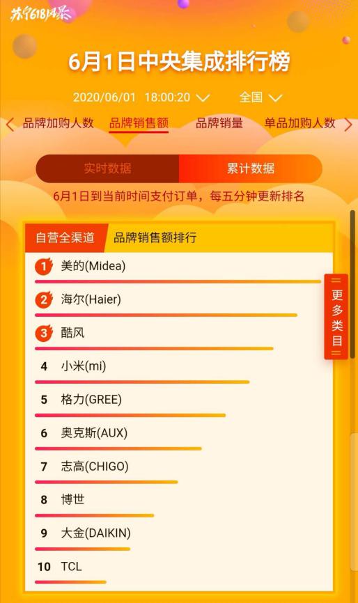 在品類表現(xiàn)上,空調(diào)、冰洗、彩電銷售火熱。爆發(fā)1分鐘,空調(diào)整體銷售破1.9億,明星產(chǎn)品美的智弧系列18小時(shí)售出160284套;截至18時(shí),健康除菌冰箱洗衣機(jī)銷售額同比增長492%。